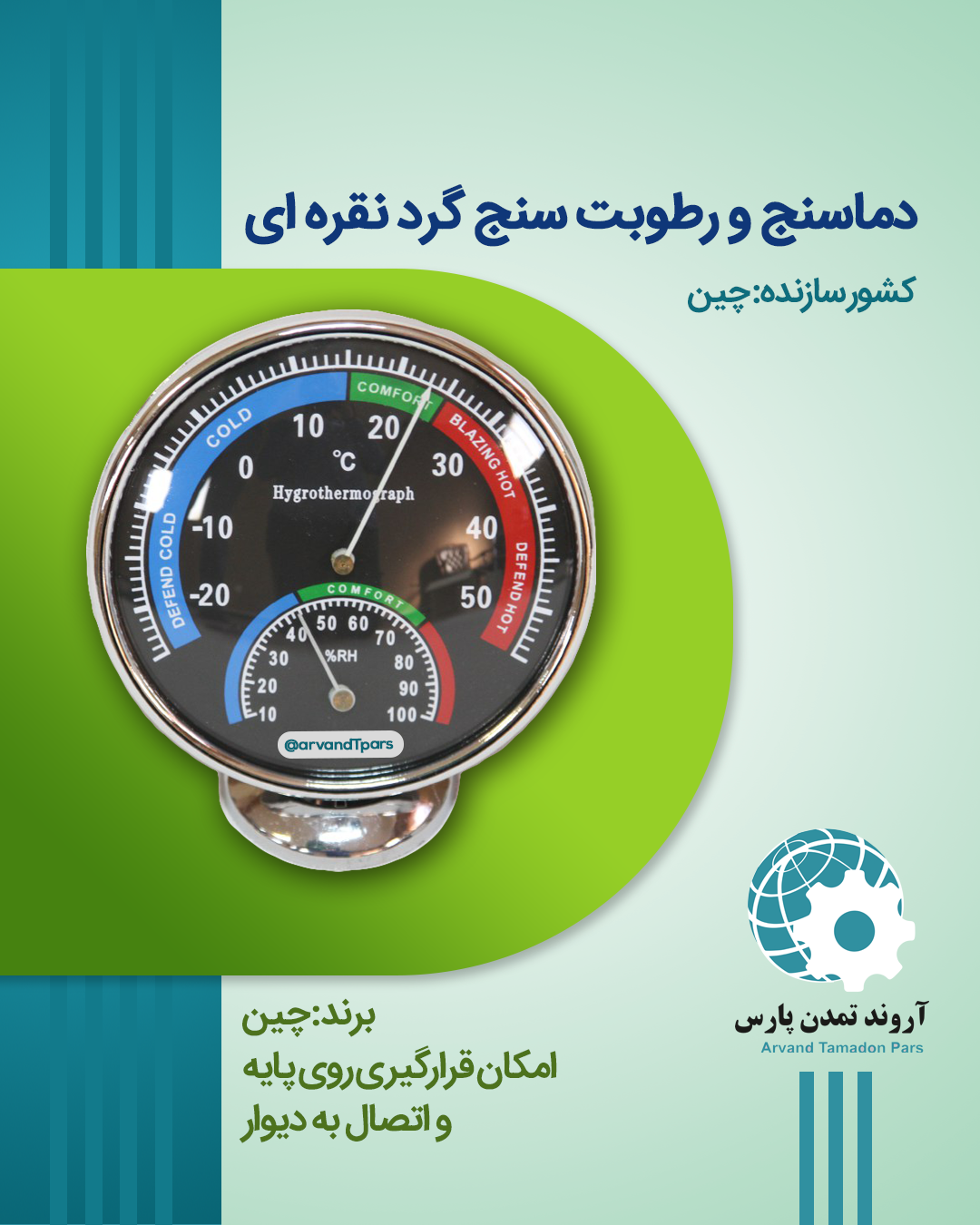 دماسنج و رطوبت سنج گرد یک دستگاه الکترونیکی است که برای اندازه گیری دما و رطوبت محیط استفاده می شود. این دستگاه دارای یک نمایشگر دیجیتال بزرگ و واضح است که دما و رطوبت را به صورت همزمان نمایش می دهد.